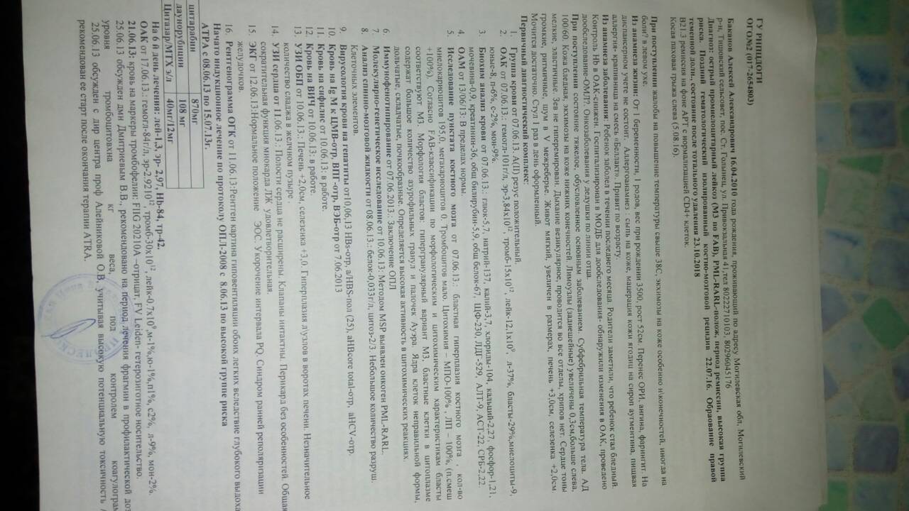 Протокол лечения состоял из 3-х курсов высокодозной химиотерапии и 2 года химиоподдержки на дому. Почти год после лечения Алексей пробыл дома как здоровый ребенок без лекарств и запретов. Но беда опять пришла в наш дом: в 2016 году у Алексея случился рецидив на молекулярном уровне в костном мозге. В РНПЦ ДОГИ нам назначили лечение и для того, чтобы лечить по протоколу, понадобилось лекарство, триоксид мышьяка, не зарегистрированное в стране. Нам на руки дали рецепт и сказали, что чем быстрее мы приобретем лекарство, тем лучше. При первом рецидиве нам нужно было 24 ампулы. Мы с огромным трудом нашли деньги! Помогли тогда друзья и родные, отзывчивые люди. Лекарство было приобретено, и Алексей прошел 4 курса триоксида мышьяка и АУТО трансплантацию.
