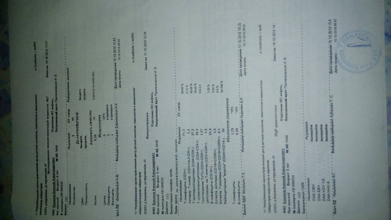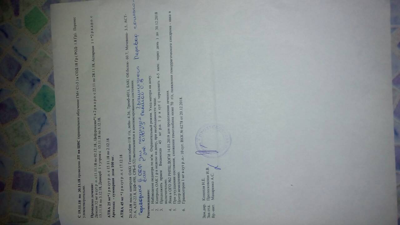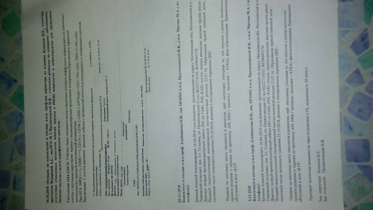 Почти месяц нас возили из нейрохирургии в ДОГИ и решали, как нас лучше лечить. В итоге Алексея прооперировали в нейрохирургии. Операция прошла успешна и у сына хирурги удалили все тотально. Взяли опухоль на биопсию. Оказалось, что у нас рецидив второго нашего лейкоза. Нам назначили протокол и выдали рецепт на покупку лекарства триоксида мышьяка в размере 48 ампул. Сейчас лекарство стоит очень дорого, в Германии цена 10 ампул стоит 7000 евро. На все лечение Алексею требуется 35000 тыс. евро. У нас таких денег нет, да и в нашей семье еще растет маленький ребенок 11 месяцев.