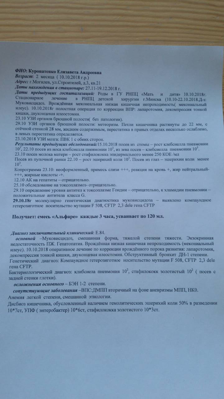 Сейчас Лиза нуждается в специальном лечебном питании и обогатителе грудного молока, так как только при помощи препаратов она понемногу стала набирать в весе. Также ребенок нуждается в употреблении креона в каждое кормление, постоянных ингаляциях, жирорастворимых витаминах, и урсодезоксихолевой кислоты.