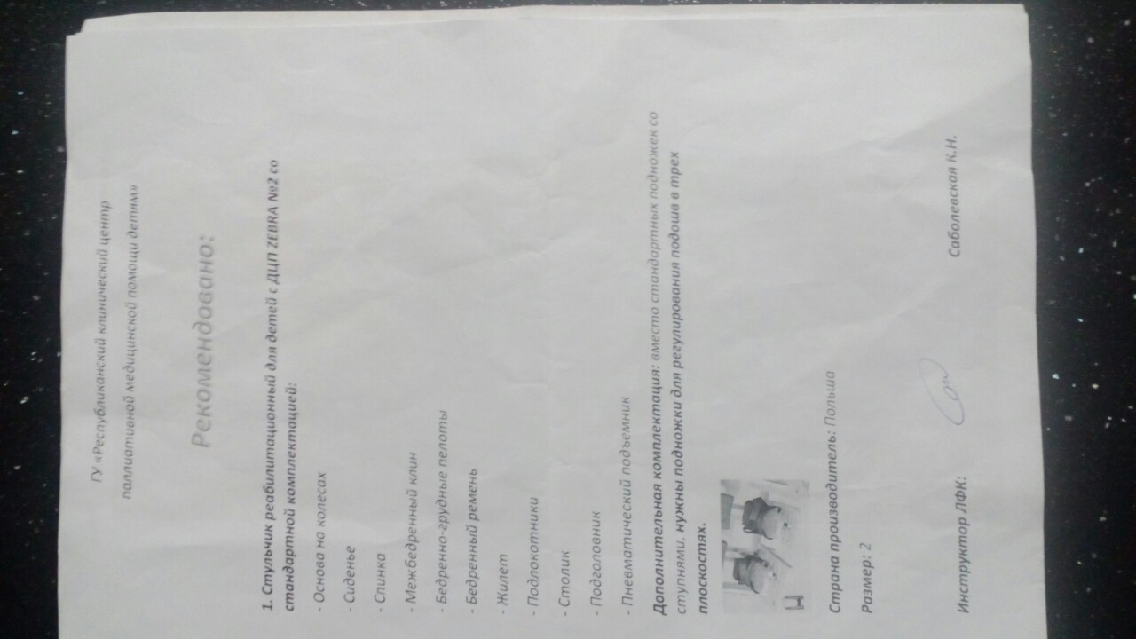Специалистами ГУ "Республиканского центра паллиативной медицинской помощи" помимо медикаментозного лечения и физической терапии было рекомендовано приобрести стульчик Зебра, который предназначен для детей с ДЦП . В этом стульчике телу ребенка придается правильное положение, что замедлит процессы деформации. Это облегчит жизнь Даши и сделает её жизнь более комфортной.