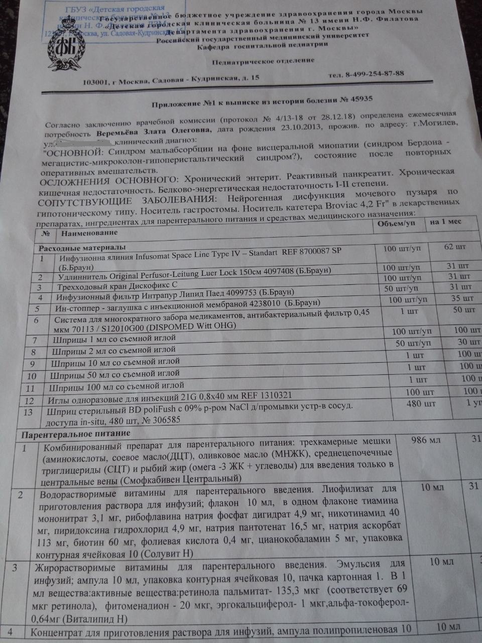 Нашей маленькой подопечной Злате Веремьёвой (ее история болезни здесь https://vk.com/hospismogilev?w=wall-3490210_406/all) врачи при выписке выдали целый список того, что поможет ей кушать. Это ЕЖЕМЕСЯЧНАЯ потребность !!! Мы просим всех, у кого есть возможность приобрести что-то из этого списка, или по-прежнему помочь материально на реквизиты ОАО "АСБ Беларусбанк" в отделении № 700/86 БИК AKBBBY21700 транзитный счет BY64 AKBB 3819 3821 2099 5700 0000 на благотворительный счет в белорусских рублях BY09 AKBB 3134 0000 1152 8702 0086 на имя Веремьёвой Татьяны Валерьевны для лечения ее дочери Златы