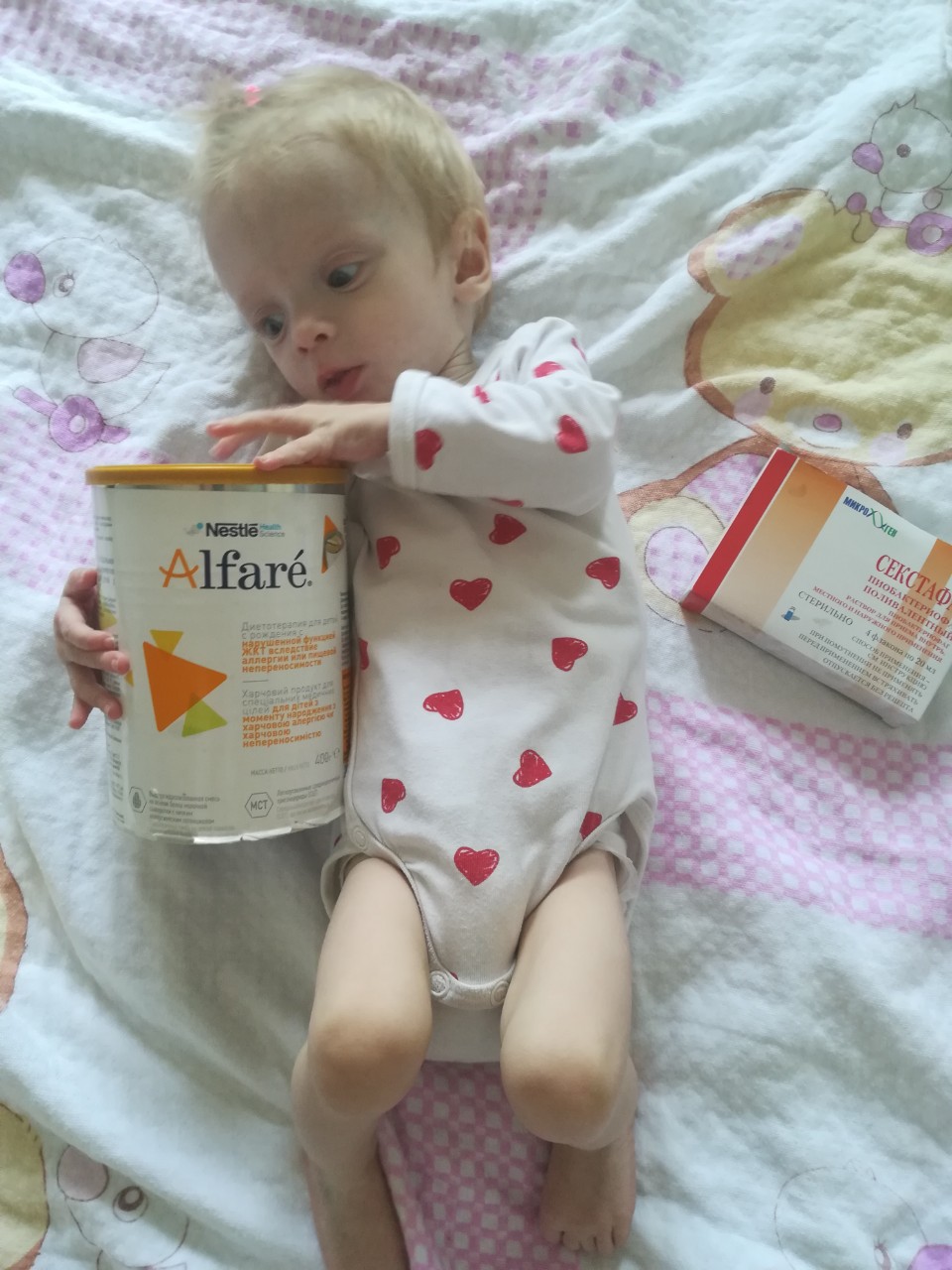 Сейчас Лиза нуждается в специальном лечебном питании и обогатителе грудного молока, так как только при помощи препаратов она набрала в весе за последние полгода 700 грамм. Также ребенок нуждается в употреблении креона в каждое кормление, постоянных ингаляциях, жирорастворимых витаминах, и урсодезоксихолевой кислоте.