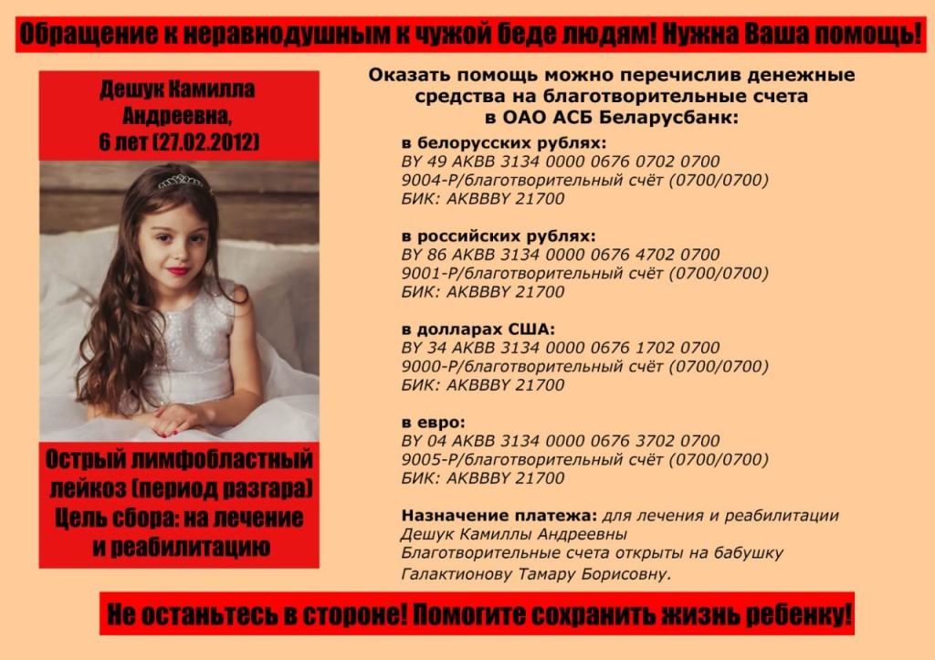 У нас появилась новая подопечная, замечательная семилетняя девочка, Камилла Дешук. Она обычная девчонка, такая же как и все семилетние девочки. Она уже даже успела пойти в школу, как случилась беда. Мы очень рассчитываем на ваше сострадание и помощь! Ниже письмо ее мамы и все реквизиты , чтобы вы смогли хоть чем-то помочь Камилле.