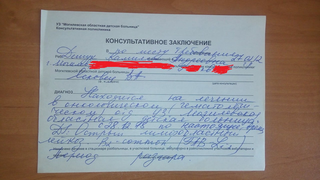Камилла родилась абсолютно здоровым ребенком, росла и развивалась как все детки. В мае 2018 года закончила детское дошкольное учреждение. В сентябре 2018 года пошла в первый класс, а к концу сентября начала часто болеть простудными заболеваниями, проходила лечение, но эффект от лечения был недолгим. Через неделю все повторялось. В конце декабря резко стало хуже, кашель был сильнее, кровотечение из носа, побледнела кожа, высокая температура, боли в животе, кровавые точки под глазами, болели сильно ножки, почти не ходила. После очередной сдачи анализа крови в поликлинике по месту жительства Камилла была срочно госпитализирована в онкологическое отделение УЗ " Могилевская областная больница", где ей был поставлен диагноз острый лимфобластный лейкоз (ОЛЛ).