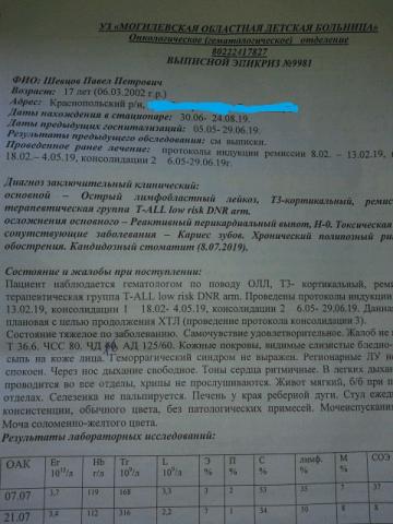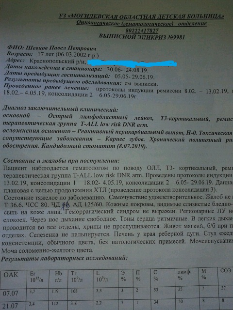 После обращения в районную поликлинику Павла отправили на консультацию в Могилевскую детскую областную больницу, где 05.01.2019 мальчику поставили диагноз: Острый лимфобластный лейкоз.
