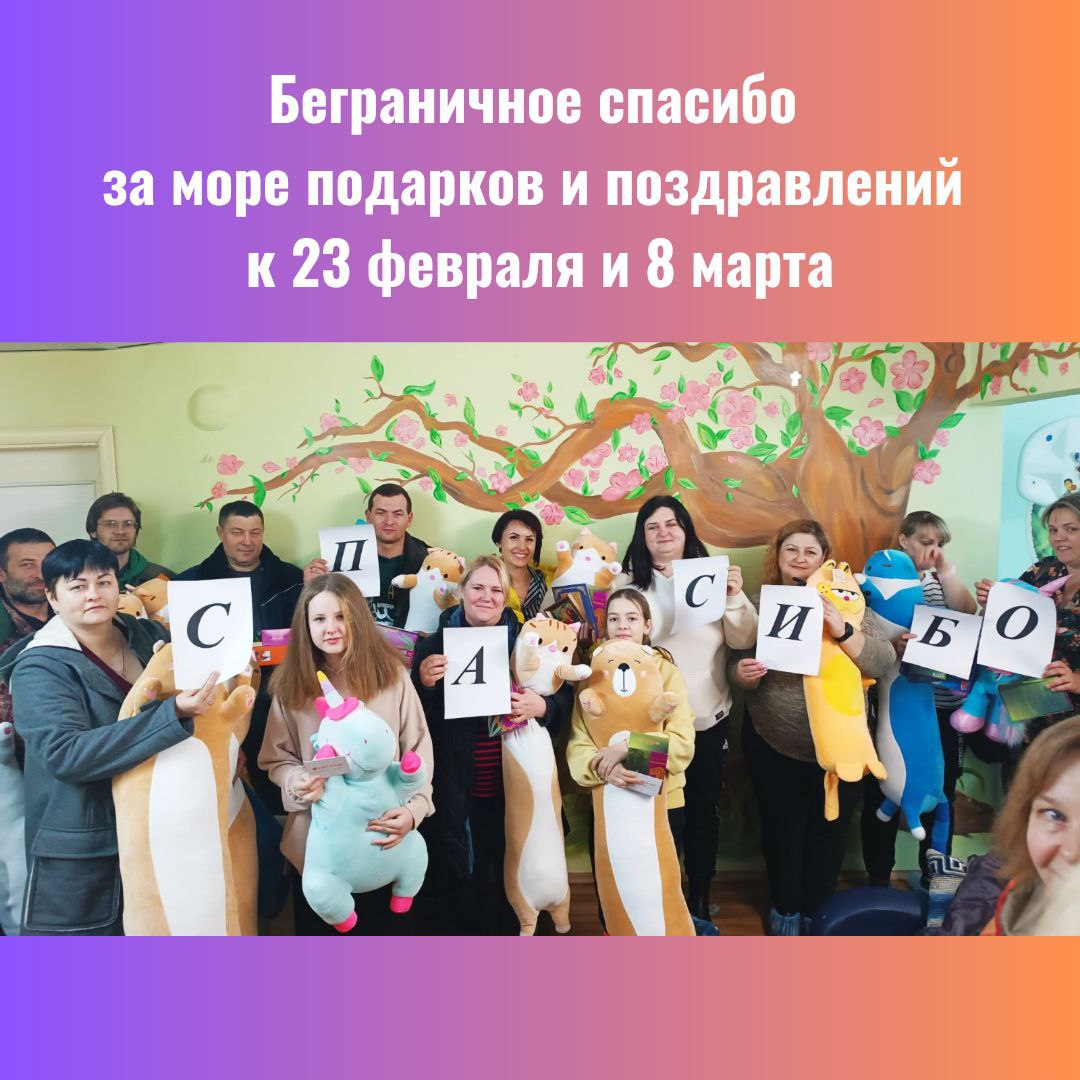 Благодаря вам и вашей помощи наши детки и мамы получили замечательные подарки на 23 февраля и 8 марта: большие мягкие игрушки-обнимашки, наборы для творчества, наборы косметики, настольные игры и море радости, улыбок, слов поддержки.
